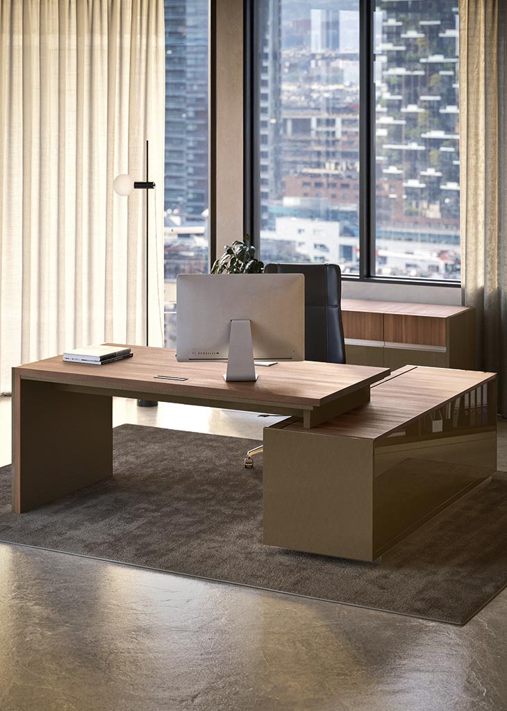 For the Porta Romana Home Office Collection, we combined rich walnut wood with high-gloss golden accents to create a workspace that brings together elegance and function.